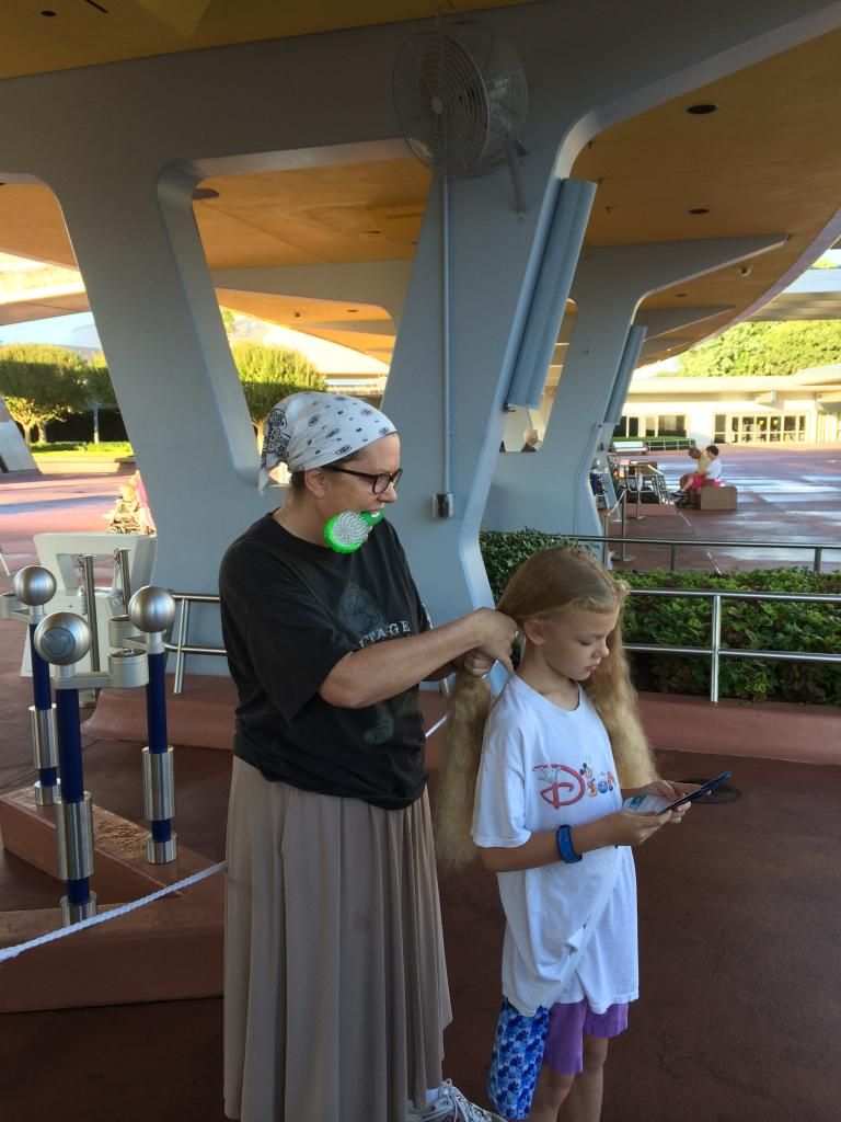 We had plenty of time before park opening, so i was tacky once again and did the 7yo's hair while waiting for rope drop.