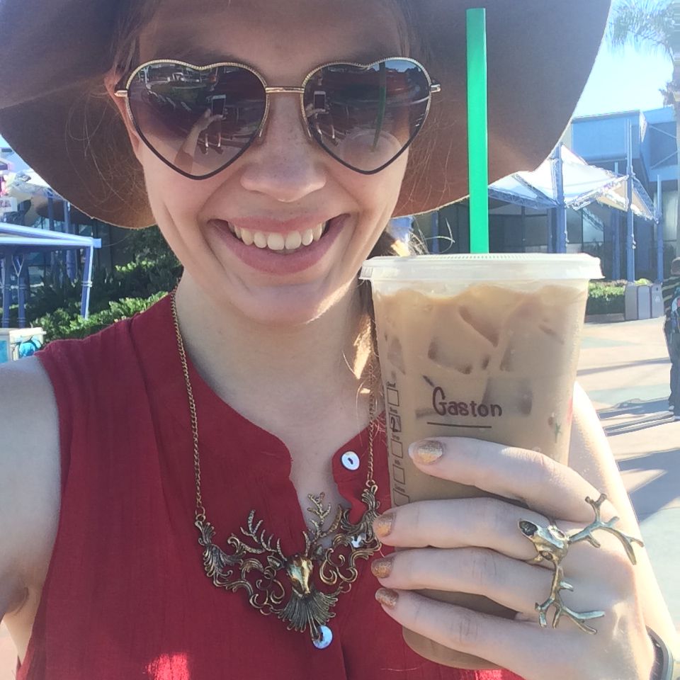 The cup says Gaston because she was Disneybounding as Gaston that day.