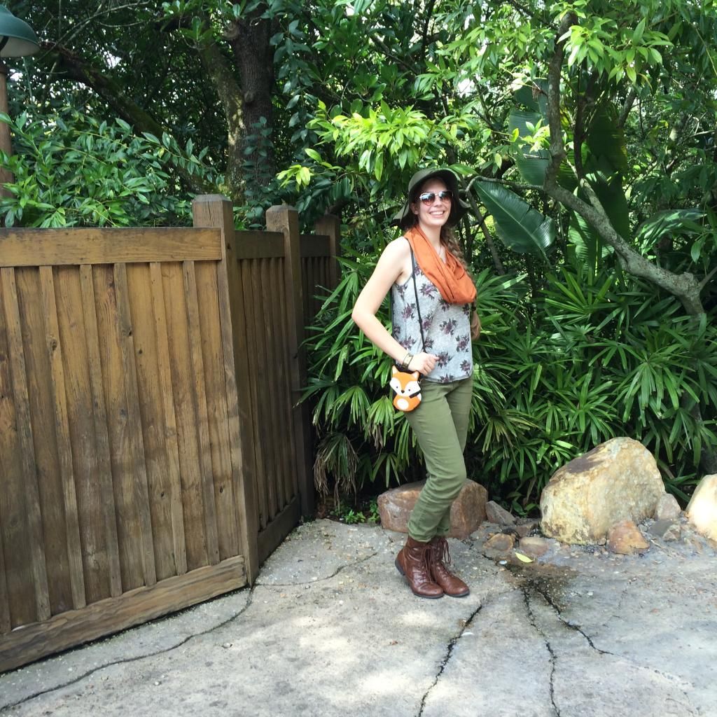 For our Animal Kingdom day, my 19yo Disneybounded as Robin Hood from the Disney animated movie. She wore Robin Hood type colors with a fox purse and some fox jewelry because in the animated version, Robin is a fox. Here is a picture of her outfit for that day: